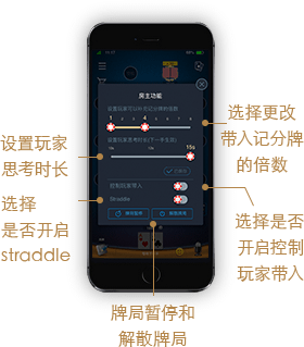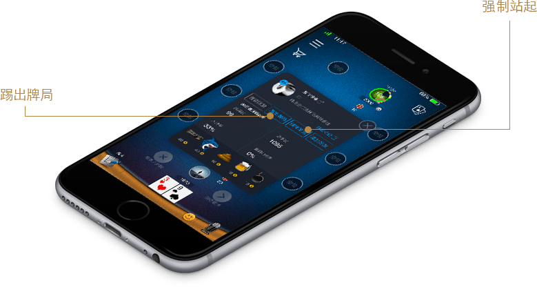 踢出牌局——使用此功能,在此轮手牌结束后,该玩家被踢出出局,出局后,玩家不可再次进入该牌局游戏。